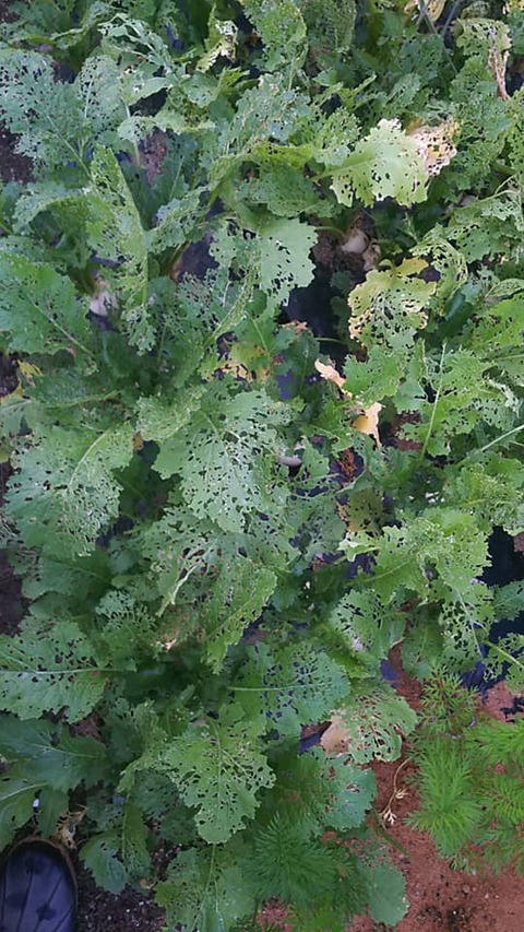 小松菜の葉に小さな穴が空く、小松菜の葉がかじられている
